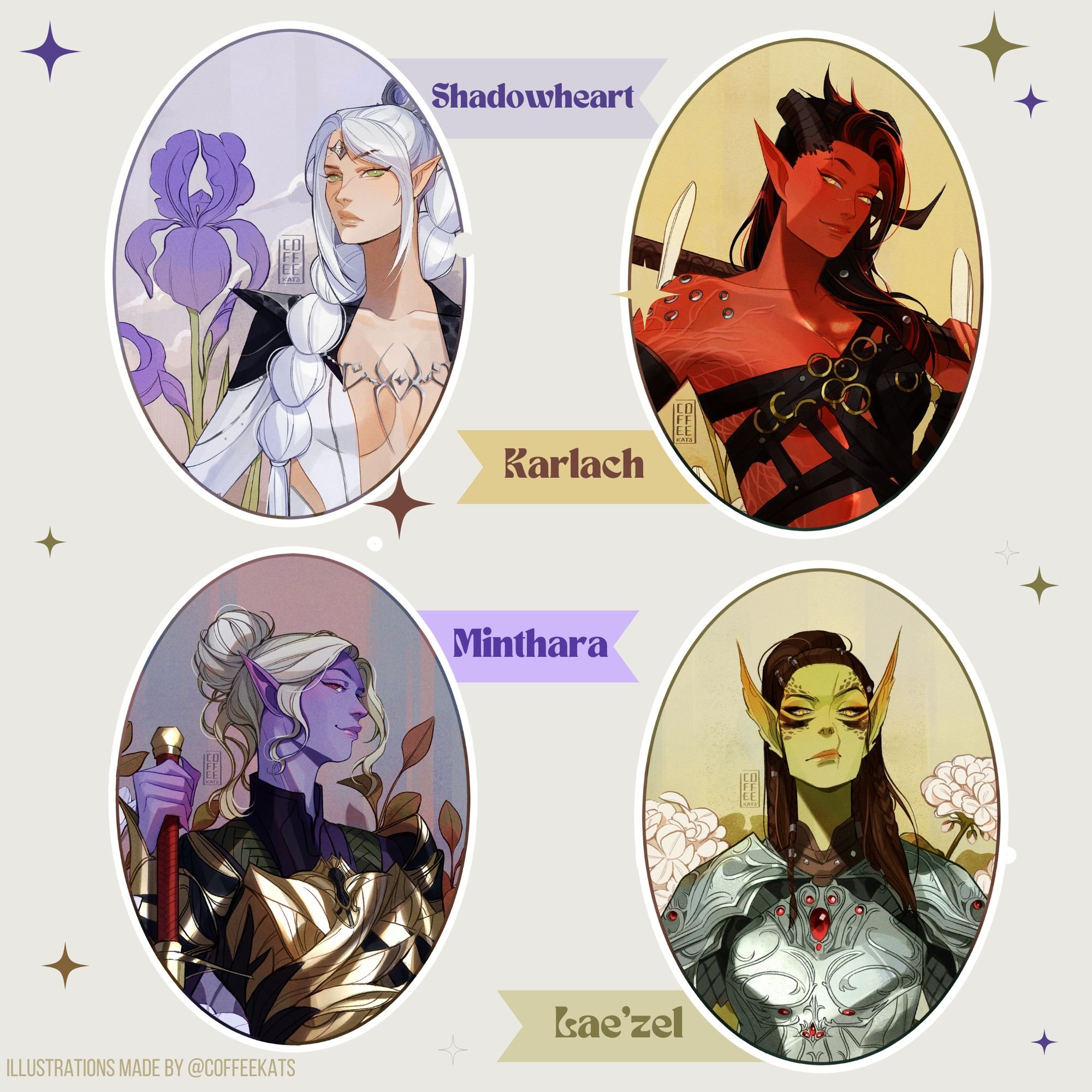 ✧ Die-cut vinyl stickers with a glossy finish, featuring illustrations inspired by the companions Shadowheart, Karlach, Lae'zel and Minthara from the popular video game "Baldur's Gate 3". Suitable for decorating multiple surfaces such as book/journal/sketchbook covers, laptops, water bottles, etc.