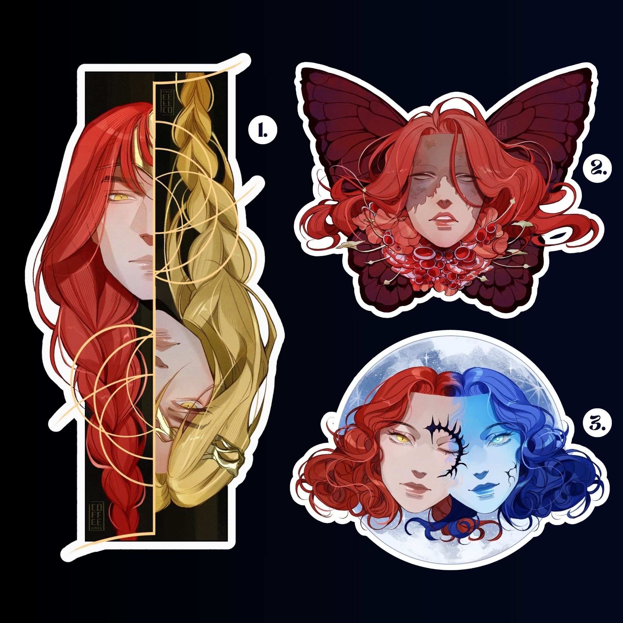 ✧ Die-cut vinyl stickers with a glossy/matte finish, featuring illustrations inspired by the characters Marika,Radagon,Melania and Ranni the Witch from the popular video game "Elden Ring". Suitable for decorating multiple surfaces such as book/journal/sketchbook covers, laptops, water bottles, etc. (safe for dishwashing!)
